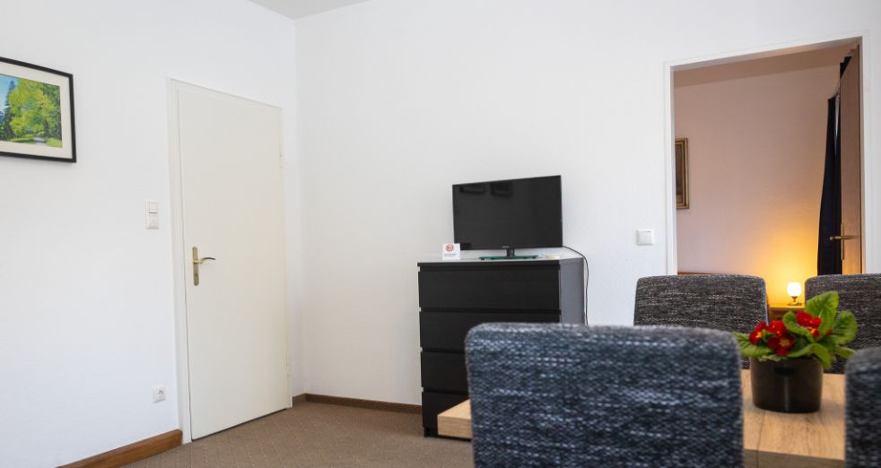Im Nebenhaus im 1. Stock gelegen mit Ausgang zur Grünfläche. Separate Badewanne und Dusche. Dieses Appartement kann auch mit 3 Personen belegt werden, da sich im Wohnzimmer eine ausziehbare Couch befindet.